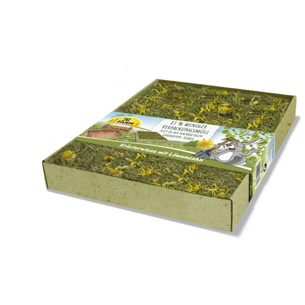 Bylinková louka s lahodnou pampeliškou a dalšími cennými bylinkami je vítanou okusovací zábavou a druhově vhodným krmením. Lze jej umístit do domova pro hlodavce spolu s miskou z lepenky na jedlou trávu. Zelená část rostlin je bohatá na přírodní surovou vlákninu, kořeny podporují opotřebení zubů a spolu s přichycenou zeminou dodávají zvířeti další minerály. Bylinková louka se skládá ze 100% přírodních materiálů a je tedy zcela jedlá. Přirozenější už to být nemůže! Pampeliška také poskytuje domácím mazlíčkům mnoho přírodních vitamínů a minerálů, dokáže povzbudit metabolismus a podpořit trávicí trakt a močové cesty. Vyvarování se zbytečných obalů a použití travnatého kartonového tácu zároveň šetří celkem 83 % obalového odpadu. Karton na trávu je vyroben z minimálně 30 % trávy. Tráva je rychle rostoucí surovina, a proto je alternativou šetrnou ke zdrojům a životnímu prostředí. Kromě toho je při výrobním procesu potřeba méně vody a šetří se emise CO2.