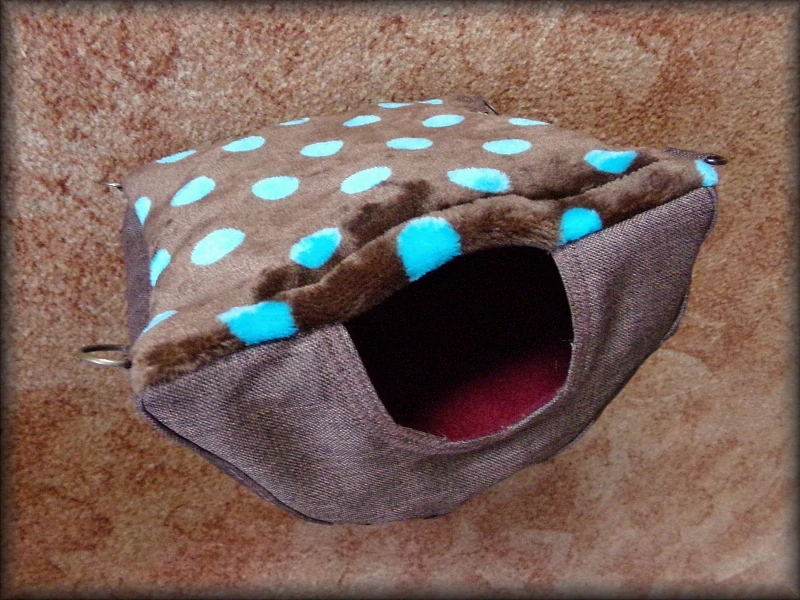 Závěsný pelíšek. Není to kostka, ale ležatý půlválec, s jedním vchodem a hamakou navrchu, s kovovými poutky a karabinkami. Řetízek lze dokoupit v sekci Ostatní potřebné.