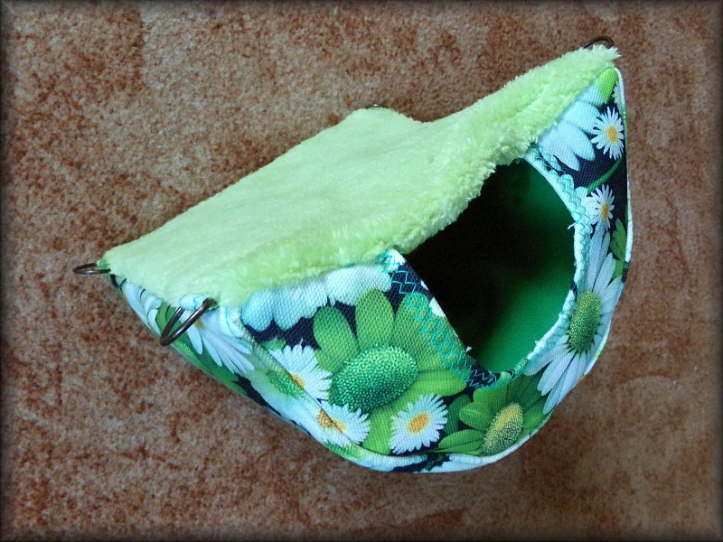 Závěsný pelíšek. Není to kostka, ale ležatý půlválec, s jedním vchodem a hamakou navrchu, s kovovými poutky a karabinkami. Řetízek lze dokoupit v sekci Ostatní potřebné.