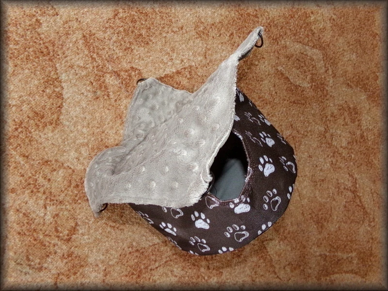 Závěsný pelíšek. Válec s pevným dnem, jedním vchodem a hamakou navrchu, s kovovými poutky a karabinkami. Řetízek lze dokoupit v sekci Ostatní potřebné.